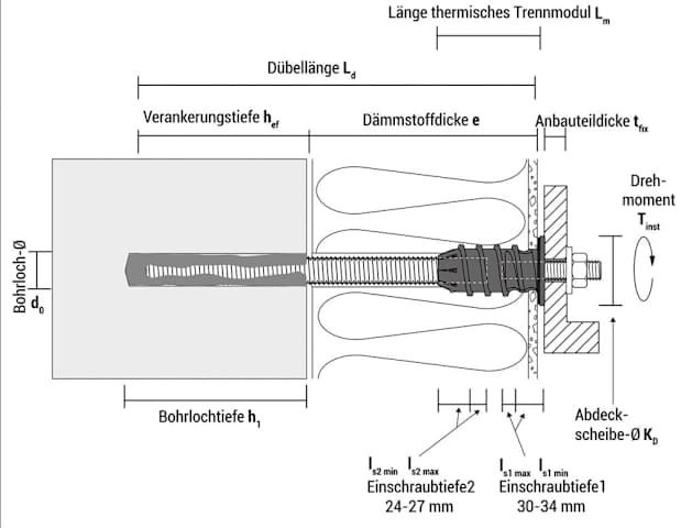 • Hohe Anwendungsflexibilität: Ein Set für alle Dämmstoffarten und -dicken von 60–300 mm in Beton und 60–250 mm in Lochsteinen (ResiTHERM® 16), von 60–220 mm in Beton und 60–160 mm in Lochsteinen (ResiTHERM® 12