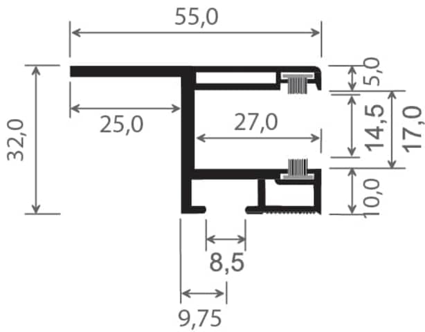 Rollladenführung 55x32 mm Lg. 6,00 m foliert, mit Nase, mit zwei schwarzen Bürsten GK Grau 129 3002-195 QUARZ PLATIN [4]