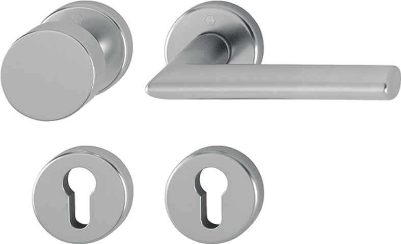 Aluminium-Innentür-Rosetten-Garnitur (Türgriff-Garnitur): geprüft nach DIN EN 1906 (Benutzungs-Kategorie 3), Türgriffe mit HOPPE-Schnellstift-Verbindung (mit HOPPE-Vollstift), Rosetten mit Kunststoff-Unterkonstruktion, Rückholfeder und Stütznocken, verdeckte, durchgehende Verschraubung mit selbstschneidenden Gewindeschrauben.