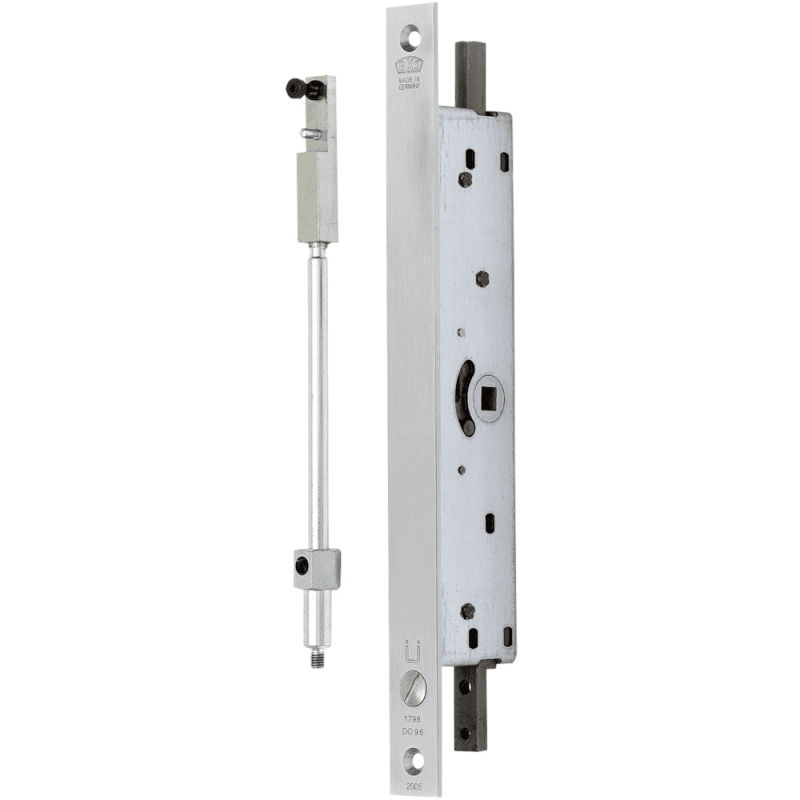 BKS Umlenkschloss B 1798; Produkttyp: Umlenkschloss; Produkttyp (Hersteller): Umlenkschloss; Einsatzbereich: für Treibriegelstange; Drückernuss: einteilig; Stulpform: Flachstulp; Material Stulp: Edelstahl; Schlosskasten: geschlossen; Schlosskastenhöhe: 210 mm; Schlosskastenstärke: 18 mm; Türart: Rohrrahmen; Türflügelanzahl: zweiflügelig; Türwerkstoff: Aluminium,Stahl; Dornmaß: 60 mm; Hinterdornmaß: 15 mm; Drückernussvierkant: 9 mm; DIN-Richtung: DIN Links-Rechts; Stulpausführung: kantig; Stulpbreite: 24 mm; Stulplänge: 295 mm; Stulpstärke: 3 mm; Farbton Stulp: edelstahl; Oberfläche Stulp: matt; Zusatzfunktion-/Ausstattung: mit Pendel-Regulierkupplung; Einbautiefe Schlosskasten: 72 mm