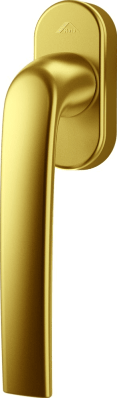 Roto Fenstergriff Roto Samba; Produkttyp: Fenstergriff; Produkttyp (Hersteller): Fenstergriff; Ausführung: Standard; Rastung: 90°; Stütznocken: mit Stütznocken; Verriegelungsart: mit selbsttätiger Verriegelung; Material: Aluminium; Montageart: aufliegend; Befestigungsart: verdeckt verschraubt; Technik: Secustik®; Anwendung: innen; Länge: 112 mm; Befestigungsabstand: 43 mm; Form Rosette: oval; Breite Rosette: 28,6 mm; Höhe Rosette: 65,6 mm; Stärke Rosette: 13 mm; Durchmesser Stütznocken: 9,7 mm; Norm: DIN EN 13126-3; Einsatzbereich: Drehkipp; Fensterwerkstoff: Aluminium,Holz,Kunststoff; Vierkant: 7 mm; Stift vorstehend: 43 mm; Zubehör: mit Schrauben; Schraubengröße: M5x55; DIN-Richtung: DIN Links-Rechts; Farbe: gelb; Farbton: messing; Oberfläche: matt,eloxiert; Aufdruck: mit Logo