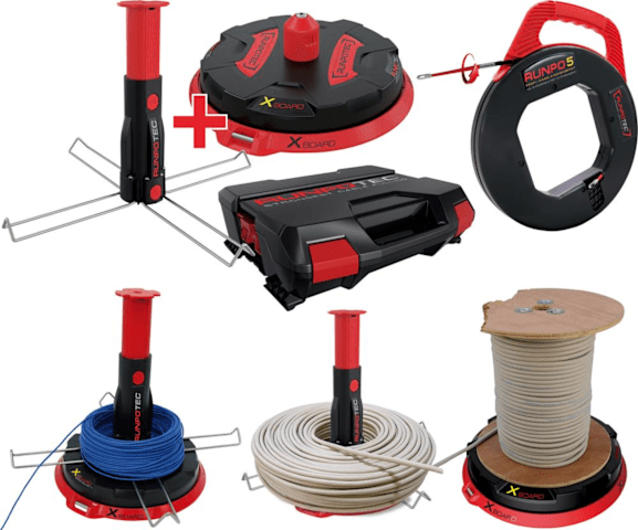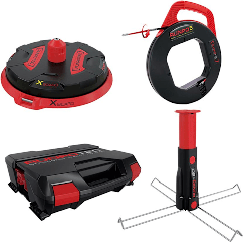 Lieferung: Kabeleinziehgerät RUNPO 5 Profi 30 m, für Rohrdurchmesser 16–40 mm, 2 RUNPOGLEITER am Spiralanfang- und ende, Kabelabroller XB 300 Tragfähigkeit 300 kg, Multifunktionsdorn ausziehbar bis auf 294 mm, im Systemkoffer.