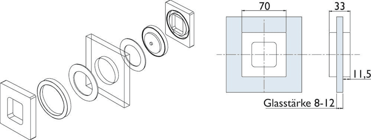 Schiebetür-Griffmuschel 6403 K geschlossen, für 8 - 12 mm Glasstärke, Glasbohrung 50 mm, kantige Ausführung, Oberfl. F1 (Silberfarben eloxiert)