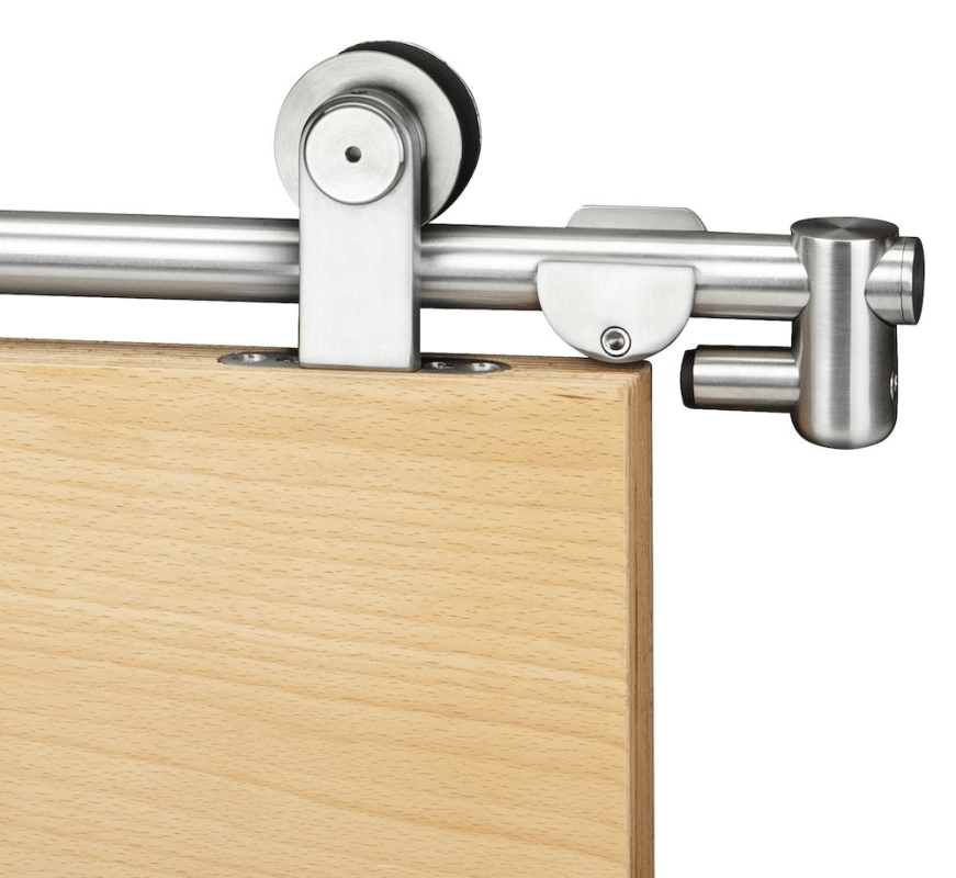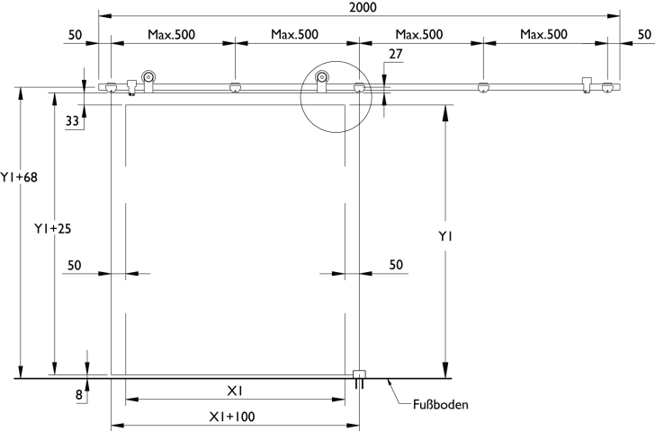 Schiebetürbeschlag für Holztüren ohne Zarge, für 1-flg. Türen bis 1000 mm Türbreite, bestehend aus: Laufschiene 2000 mm, 2 Laufwagen, Bodenführung, 2 Stopper oben, 5 Wandbefestigungen, Oberfl. 60 (Ede