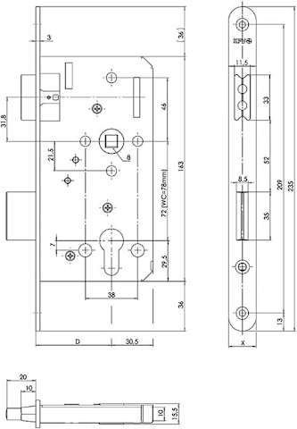 Pendeltür-, Schiebetür-, Glastür-, Fallen-, Riegel- und Spezialschloss für Holztüren 116-1/2-F/65-M-18-A-44