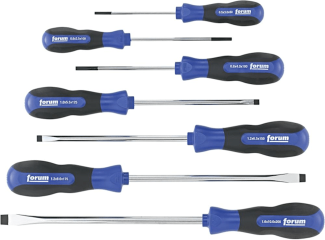 7 Schraubendreher für Schlitz-Schrauben 3,5 x 80; 3,5 x 100; 4 x 100; 5,5 x 125; 6,5 x 150; 8 x 175; 10 x 200 mm.
