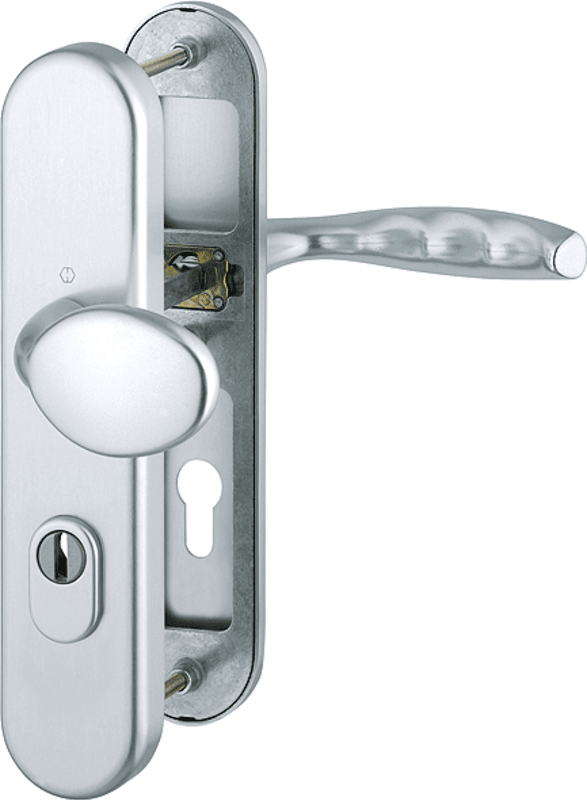 HOPPE Vollblatt Sicherheits-Wechselgarnitur New York 76G/3332ZA/3410/1810H,Langschild,ES 1,mit Zylinderabdeckung 72/8,DIN Links-Rechts,naturfarben eloxiert,Türstärke41-46,gekröpft/gebogen fest