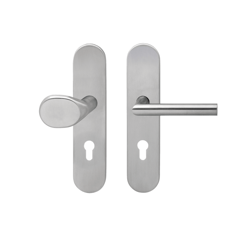 Edelstahl Schutzbeschlag – ESG 675, Einbruchsicherheit nach DIN 18257 ES1. Eigenschaften: • mit gekröpftem Knopf • Gleitlager aus Nylon • Türgriff Rhodos ER28 Technische Daten: • Innenschild 255 x 5
