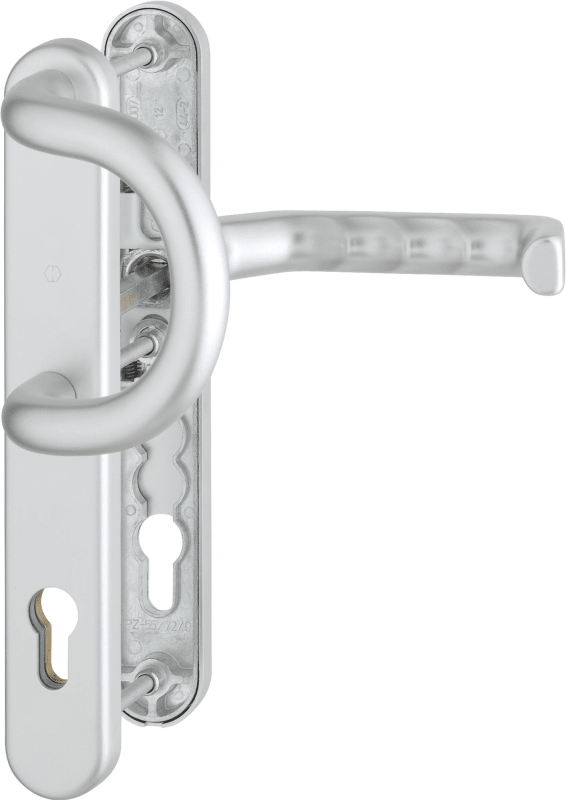 HOPPE Rohrrahmen Sicherheits-Wechselgarnitur Liverpool 538G/3358/3357N/1313G,Langschild,ES 1,ohne Zylinderabdeckung 92/8,DIN Links-Rechts,natur matt eloxiert,Türstärke67-72,Stoßgriff gebogen/U-Form ge