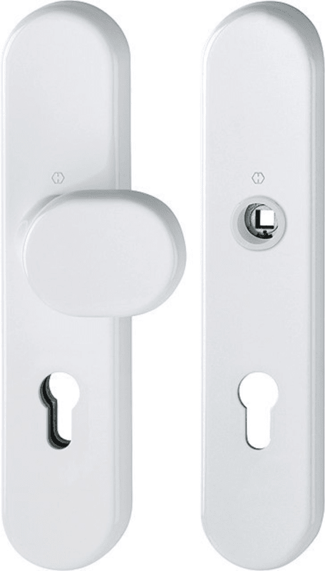 HOPPE Vollblatt Sicherheits-Wechselgarnitur 86G/3331/3310,Langschild,ES 1,ohne Zylinderabdeckung 72/8,DIN Links-Rechts,verkehrsweiß beschichtet,Türstärke37-47,gekröpft fest