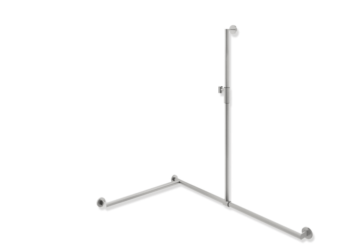 made of high-quality stainless steel, chrome-plated, vertically and horizontally arranged bars with mounting rosettes and shower holder, with laterally (for mounting) adjustable shower holder bar, left-hand version, vertical length 1250 mm, horizontal lengths (corner installation) 1185 mm and 765 mm, 88 mm deep, bar diameter 32 mm, pipe thickness 2 mm, rosette diameter 70 mm, shower holder made of high-quality matt polyamide in the HEWI colours 98 (Signal White) and 92 (Anthracite Grey), suitable for hand showers from various manufacturers, including corrosion-free HEWI fixing material.