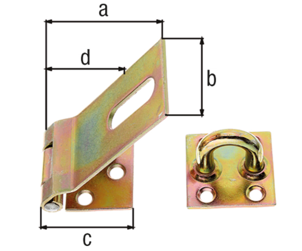 GAH Alberts Sicherheits-Überfalle; Ausführung: mit Öse auf Platte; Material: Stahl; Befestigungsart: zum Anschrauben; Oberfläche: galvanisch verzinkt,dickschichtpassiviert; Einsatzbereich: Tor; Basis: Sicherheits-Überfalle; Länge Anschraubplatte: 68 mm; Stärke: 3 mm; Länge Überwurf: 153 mm; Breite Überwurf: 50 mm; Material Stift: Stahl; Breite Anschraubplatte: 50 mm; für Bügeldurchmesser Vorhangschloss: 12 mm; Farbe: gelb; Farbton: goldgelb; Schraublochausführung: Senkkopf; Anzahl Schraublöcher Schlaufe: 4 St.; Anzahl Schraublöcher Riegelplatte: 4 St.; Schraublochdurchmesser Riegelplatte: 6 mm; Schraublochdurchmesser Schlaufe: 5,4 mm; Breite Schlitz: 32 mm; Höhe Schlitz: 32 mm