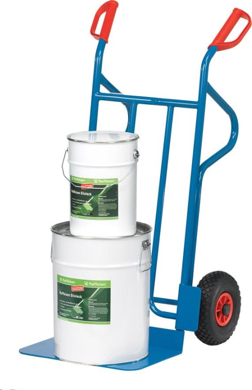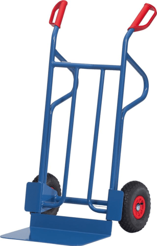 Stahlrohrkarre (Sack- und Stapelkarre) • Stahlrohr-Konstruktion: geschweißt, pulverbeschichtet in RAL 5007 brillantblau • Schaufel: Stahlblech, zum Anschrauben, austauschbar • Griffe: Sicherheitsgriffe mit Handeinfassung • Räder: Luft-Bereifung auf Kunststoff-Felgen, 260 x 85 mm • Naben: Rollenlager Lieferung: Zerlegt, einfache Montage. Hinweis: Gebogener Anlagebügel zum sicheren Transportieren von runden Gütern wie Rollen, Kannen, Eimern.