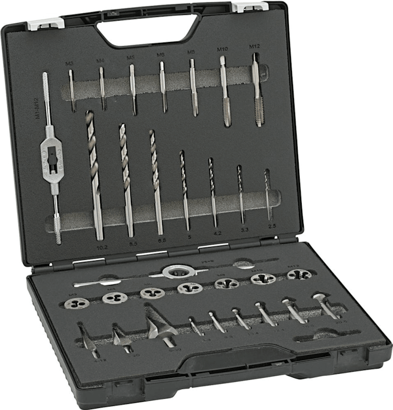 Starterkit Metallbearbeitun • Metrisc • HS • DIN 33 • Universalsortiment zur Metallbearbeitung zum Bohren und Entgraten sowie Schneiden von Innen- und Außengewinde Inhalt • HSS-Einschnittgewindebohrer M3, M4, M5, M6, M8, M10, M1 • HSS-Schneideisen M3, M4, M5, M6, M8, M10, M1 • HSS-Schneideisenhalter 25 x 9 m • HSS-Windeisen Gr. 1.1/2 • HSS-G-Kernlochbohrer DIN 338 Ø 2,5; 3,3; 4,2; 5,0; 6,8; 8,5; 10,2 m • HSS-Kegelsenker 90° Ø 6,3; 8,3; 10,4; 12,4; 16,5; 20,5 m • HSS-Stufenbohrer Ø 4–12; 4–20; 6–30 m • Gewindelehr • Handbuch Gewindeschneiden + Bohren und Senke Lieferung: Im Kunststoffkoffer.