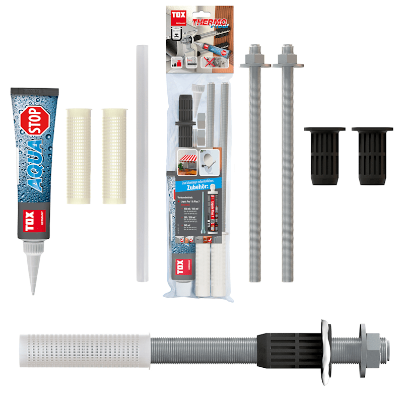 Das TOX Schwerlast-Abstandsmontagesystem Thermo Proof ist bauaufsichtlich zugelassen, ideal für wärmegedämmte Fassaden und eignet sich zur Befestigung von Markisen, Klimageräten, Satellitenschüsseln etc. sowie für die Baustoffe Beton, Hochlochziegel, Kalksandvollstein, Mauerziegel und weitere.