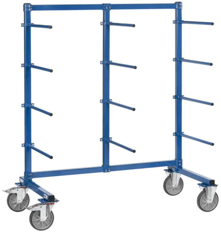 Tragarm-Wagen, 1-seitig • Quadratrohr-Rahmen: 12 Arme, pulverbeschichtet in RAL 5007 brillantblau • Schraubkonstruktion • Schraubschellen: an Rollentraversen, Pfosten und Streben • Tragarme: Stahlrohr, Ø 27 mm, mit Schraubschellen, stufenlos verstellbar • Nutzlängen: 1-seitig 600 mm • Traglasten: 1-seitig 80 kg • Rollen: 2 Bock- und 2 Lenkrollen mit Rad-Feststeller, gemäß der Europäischen Norm EN 1757-3 (Sicherheit von Plattformwagen) • Bereifung: TPE, leichtlaufend, Rad-Ø 200 mm • Naben: Rillenkugellager Lieferung: Erfolgt zerlegt. Hinweis: Langgut sicher transportieren oder lagern.