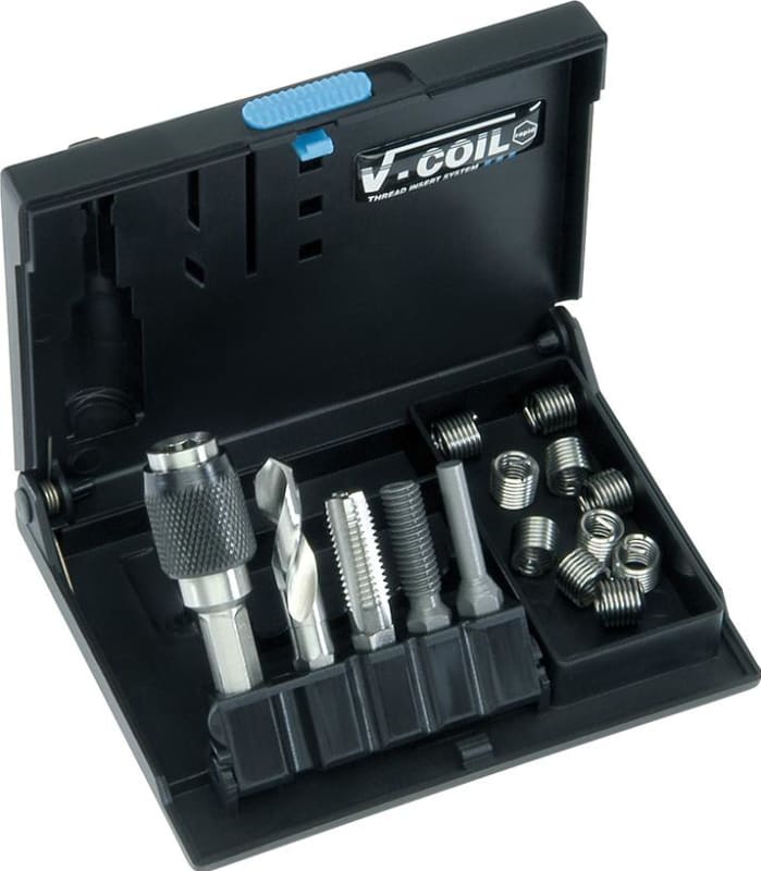 Gewinde-Reparatur-SätzeInhalt: • 10 Gewindeeinsätze und jeweils 1 passender Gewindebohrer undSpiralbohrer • Einbauwerkzeug mit 6-kant-Aufnahme • Zapfenbrecher und Universalhalter Lieferung: In Ku