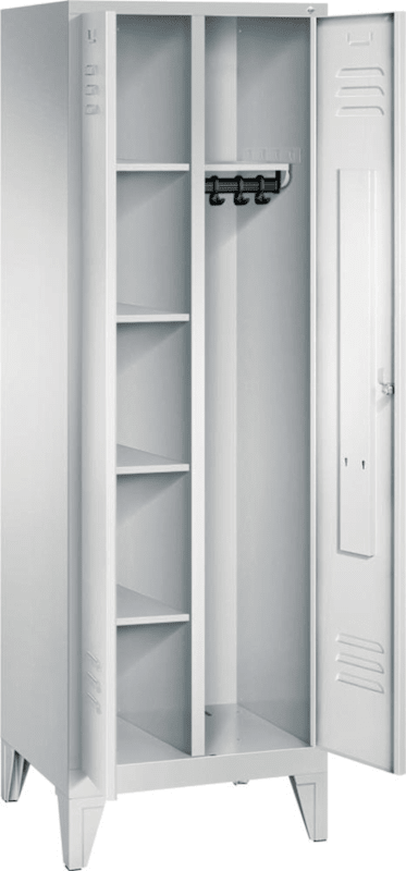 Mehrzweckschrank Classic PLUS, mit Füße • Langlebige und robuste Stahlkonstruktio • Füße aus Kunststoff, bei Korpusfarbe RAL 7035 in lichtgrau, sonst schwarzgra • Mit hochwertiger Einbrennbeschichtun • Fußteil serienmäßig verzinkt für erhöhten Korrosionsschut • Hohe Stabilität durch Materialdoppelung an den entscheidenden Stelle • Schmale Seitenkanten für homogene Optik bei Reihenstellun • Verstärkte Türen, paarweise zueinanderschlagend, mit gemeinsamen Sicherheits-Drehriegel zur Verwendung eines Vorhängeschlosse • Türen mit Anschlagdämpfer, Belüftungs-Schlitzen und Etikettenrahme • Innenausstattung: Linkes Abteil mit 4 Einlegeboden fest eingebaut, rechtes Abteil mit Ablageboden, Garderobenstange und 3 Schiebehaken.