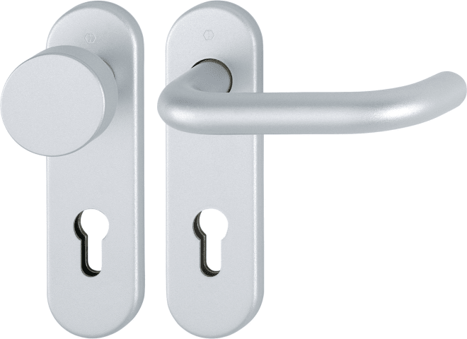 HOPPE für Feuerschutz Wechselgarnitur Paris FS-58/353K/138F, Kurzschild, oval, Profilzylinder gelocht, Entfernung 72mm, Vierkant 9mm, DIN Links-Rechts, Türstärke 45 - 65mm, mit Stütznocken, natur matt
