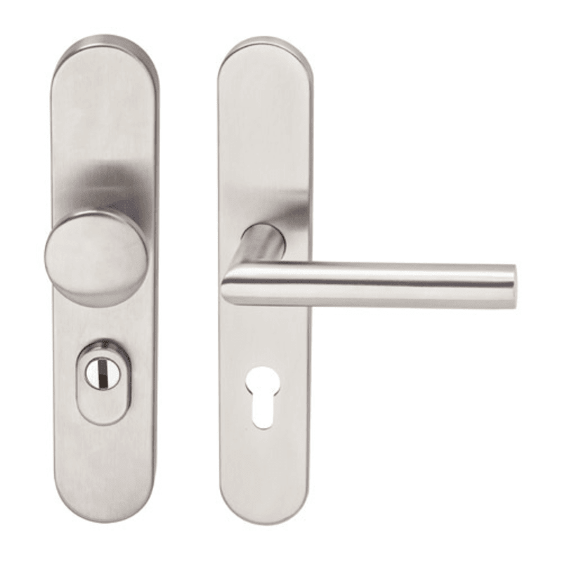 BKS Schutz-Wechselgarnitur BELCANTO B-73230; Material: Edelstahl; Befestigungsart: verdeckt verschraubt; Vierkant: 8 mm; Befestigungstechnik: mit Stütznocken; Abdeckung: Langschild; Lagerung: festdrehbar,wartungsfrei; Widerstandsklasse: ES 3 (SK4); Form: oval; Benutzerklasse: Klasse 4; Schildstärke innen: 9 mm; Einsatzbereich: Objekttür; Basis: Schutz-Wechselgarnitur; Ausführung: mit Zylinderabdeckung,mit Drücker H2.0,mit Rundknopf K1.0; Lochung: Profilzylinder gelocht; Entfernung: 72 mm; Türstärke min.: 54 mm; Befestigungssystem: Stiftverbindung; Türstärke max.: 69 mm; Drückerbefestigung: Wechselstift; Norm: DIN EN 1906,DIN 18257; DIN-Richtung: DIN Links-Rechts; Oberfläche: matt gebürstet; Eigenschaft: Knopf fest auf Schild; Farbton: edelstahl; Türart: Abschlusstüren; Anschlagrichtung: Drücker rechts/links verwendbar; Türwerkstoff: Holz,Stahl; Schildbreite außen: 50 mm; Schildbreite innen: 45 mm; Schildlänge außen: 250 mm; Schildlänge innen: 252 mm; Drückerhöhe: 70 mm; Drückerlänge: 135 mm; Knopfform: rund; Knopfdurchmesser: 50 mm; Schildstärke außen: 15 mm; Knopfhöhe: 57 mm; Drückerform: Gehrung,gerade; Drückerdurchmesser: 21 mm