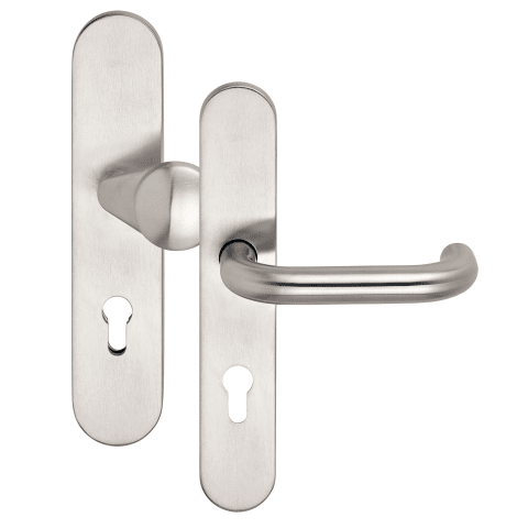 BKS Schutz-Wechselgarnitur RONDO B-73320; Material: Edelstahl; Befestigungsart: verdeckt verschraubt; Vierkant: 8 mm; Befestigungstechnik: mit Stütznocken; Abdeckung: Langschild; Lagerung: festdrehbar,wartungsfrei; Widerstandsklasse: ES 1 (SK2); Form: oval; Schildstärke innen: 9 mm; Einsatzbereich: Objekttür; Basis: Schutz-Wechselgarnitur; Ausführung: mit Drücker H1.0,mit Rundknopf K1.1; Lochung: Profilzylinder gelocht; Entfernung: 72 mm; Türstärke min.: 37 mm; Befestigungssystem: Stiftverbindung; Türstärke max.: 42 mm; Drückerbefestigung: Wechselstift; Norm: DIN 18257,DIN EN 1906; DIN-Richtung: DIN Links-Rechts; Oberfläche: matt gebürstet; Eigenschaft: Knopf fest auf Schild; Farbton: edelstahl; Türart: Abschlusstüren; Anschlagrichtung: Drücker rechts/links verwendbar; Türwerkstoff: Holz,Stahl; Schildbreite außen: 50 mm; Schildbreite innen: 45 mm; Schildlänge außen: 250 mm; Schildlänge innen: 252 mm; Drückerhöhe: 70 mm; Drückerlänge: 145 mm; Knopfform: gekröpft,rund; Knopfdurchmesser: 50 mm; Schildstärke außen: 15 mm; Knopfbreite: 71 mm; Knopfhöhe: 69 mm; Drückerform: U-Form; Drückerdurchmesser: 21 mm