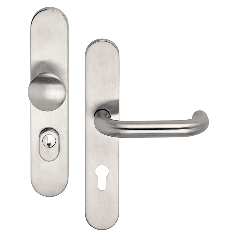 BKS Schutz-Wechselgarnitur RONDO B-75230; Material: Edelstahl; Befestigungsart: verdeckt verschraubt; Vierkant: 9 mm; Befestigungstechnik: mit Stütznocken; Abdeckung: Langschild; Lagerung: wartungsfre