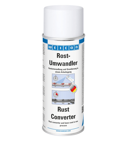 WEICON Rostumwandler: Für die effektive Neutralisierung von Rost auf angerostetem Gusseisen und Stahluntergründen. Schützt vor Korrosion im Innen- und Außenbereich. Der Rostumwandler basiert auf Epoxidharz und bildet mit der neutralisierten Rostschicht einen metallisch-organischen Eisenkomplex. Diese Verbindung wird durch das spezielle Epoxidharz stabilisiert, wodurch Metalle vor äußeren Einflüssen geschützt werden. Die sich bildende schwarze Schicht dient als Grundierung und ist die Basis für die nachfolgende, dauerhafte Beschichtung. Das Spray ist anti-korrosiv, hat ein sehr gutes Kriechvermögen und eine hohe Deckkraft. Es ist temperaturbeständig bis +80 °C (kurzfristig < 15 min. bis +160 °C), hat eine gute Witterungs- und UV-Beständigkeit sowie eine sehr gute Lösemittelbeständigkeit. WEICON Rostumwandler ist schwermetallfrei und mineralsäurefrei. Rostumwandler kann an allen rostigen Stellen, beispielsweise an Maschinen und Anlagen, an landwirtschaftlichen Geräten sowie an Kraftfahrzeugen verwendet werden. Das Spray ist auch als schützende und vorbeugende Schicht einsetzbar.