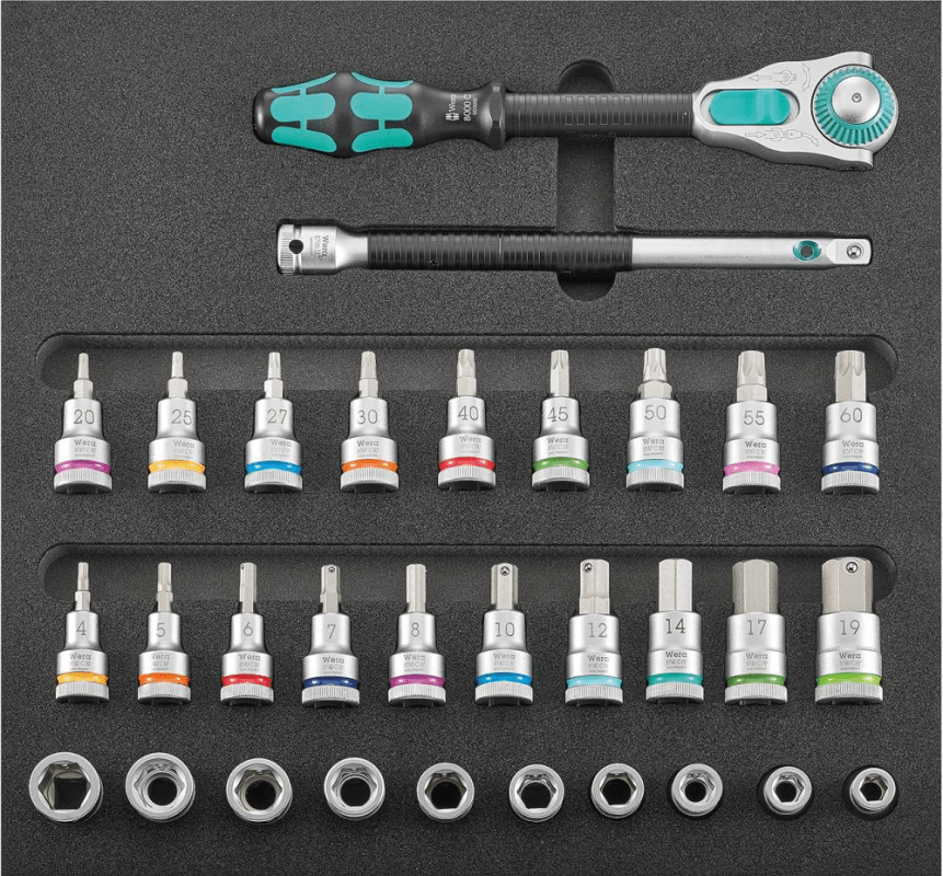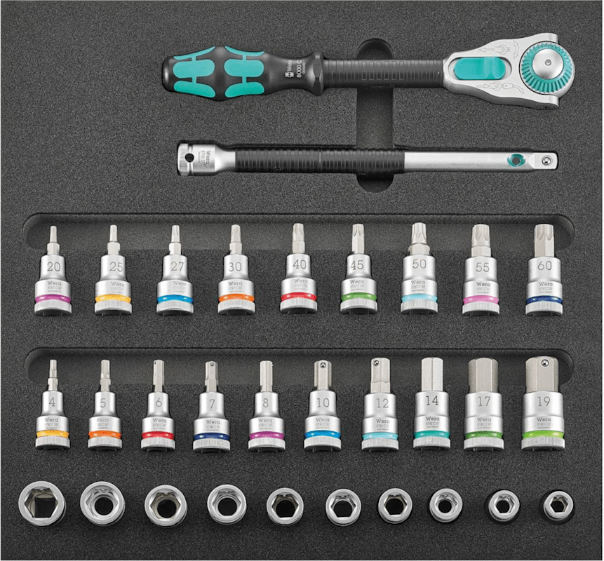 Werkzeugmodul Steckschlüssel 1/2"• 2-farbige Schaumstoffeinlage, fehlende Werkzeuge auf einen Blick erkennen Inhalt: 1 Umschaltknarre Zyklop 1/2" 10 Sechskant-Steckschlüssel-Einsätze 1/2" mit Halt