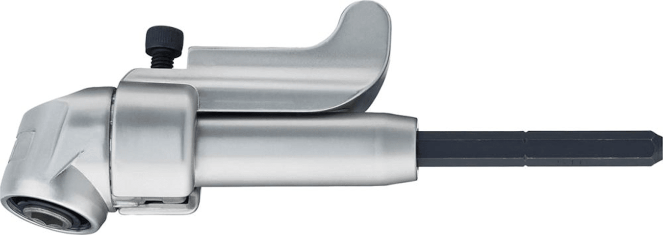 Winkelgetriebe mit Bithalte • Stahlgehäuse, mattverchrom • Kopf 105° abgewinkelt, variabel einstellba • Drehmoment-Übertragung bis zu 14 N· • 1/4"-Aufnahme für Bits, magnetisc • Geeignet für Bits en