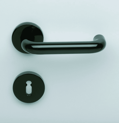 Innentür-Rosettengarnitur U-Form. Drücker und Rosetten aus Nylon. Die Garnitur verfügt über eine Schraubstift-Verbindung (Standard). Die Verschraubung der Unterkonstruktion erfolgt mittels Spaxschraub