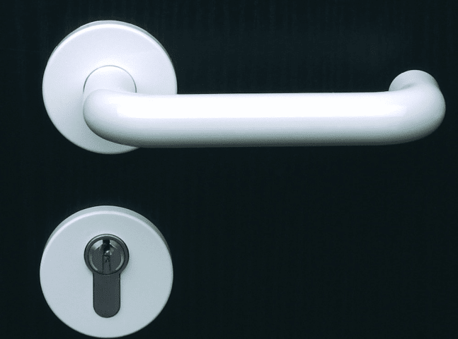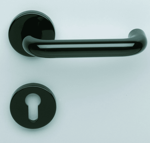 Innentür-Rosettengarnitur U-Form. Drücker und Rosetten aus Nylon. Die Garnitur verfügt über eine Schraubstift-Verbindung (Standard). Die Verschraubung der Unterkonstruktion erfolgt mittels Spaxschraub