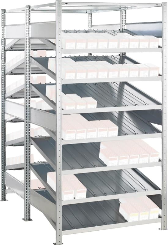 Zusatzebene für Schrägbodenregal, doppelseitig Lieferung: 2 Fachböden, verzinkt, 4 Längenriegel, 10 Trennführungen,4 Seitenführungen